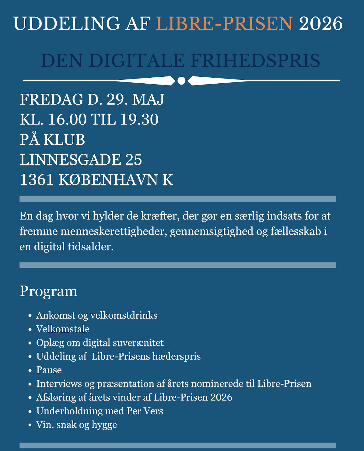 Der vil være oplæg om digital suverænitet, underholdning med Per Vers, og vi skal både uddele Libre-Prisen og Hædersprisen for en vedholdende indsats for privatlivets beskyttelse i en digital verden. Der vil blive serveret bobler/vin og snacks.